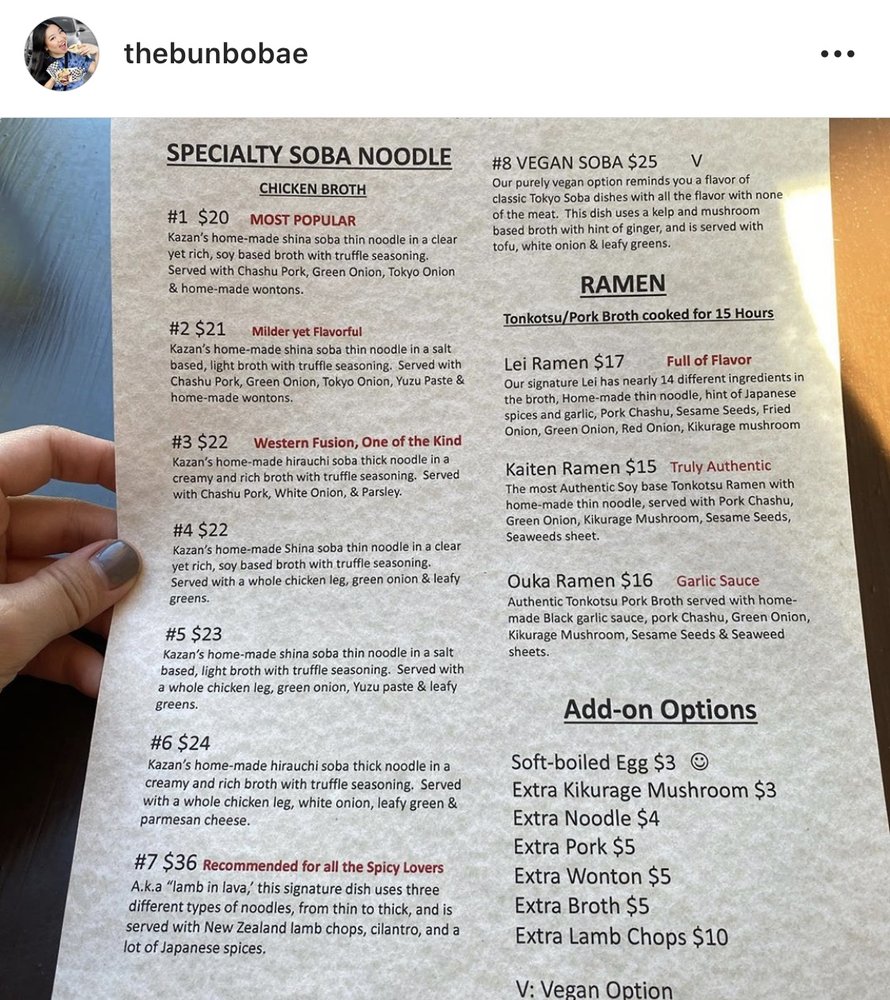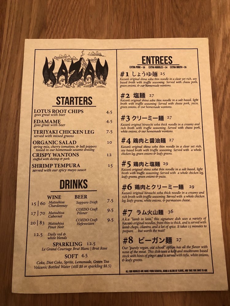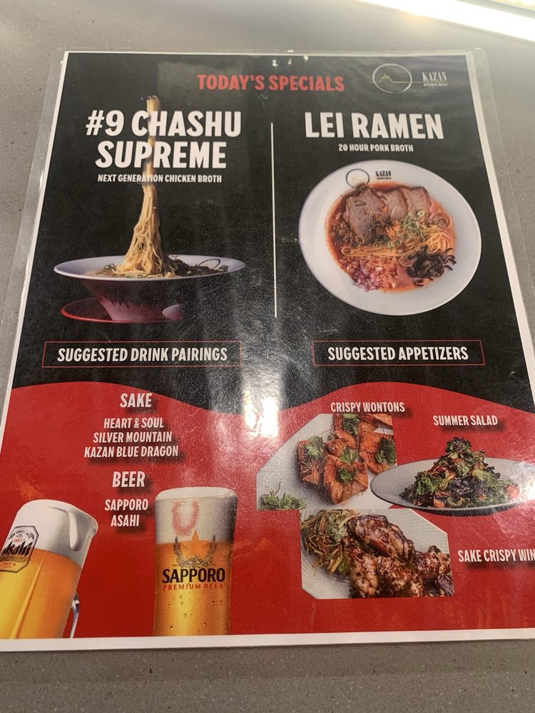"Introducing the menu at Kazan, a tapas and ramen restaurant located in Beverly Hills, CA. This trendy and upscale spot offers a variety of options for vegans and limited vegetarian choices. With a range of amenities including reserved parking, wheelchair accessibility, and QR code menus, Kazan caters to a diverse clientele. The restaurant provides a welcoming atmosphere with options for outdoor seating and private dining. The menu features a unique blend of Asian-inspired dishes, perfect for brunch, lunch, and dinner. From their happy hour specials to their beer and wine selection, Kazan offers something for everyone. With their commitment to sustainability, including compostable containers and reusable tableware, Kazan is not just a place to eat, but a dining experience worth savoring."